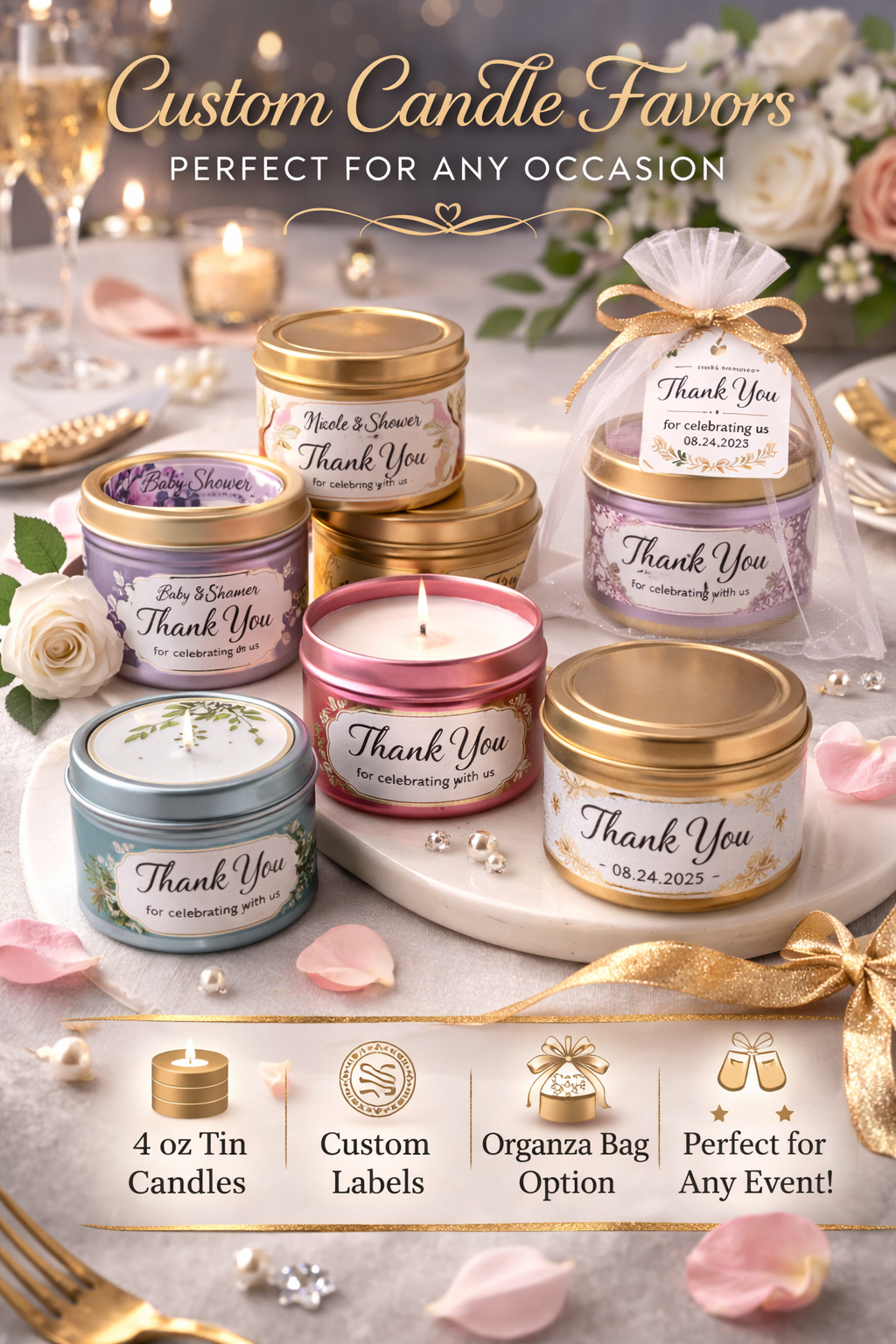 “Perfect for weddings, baby showers, birthdays & special events. Custom labels available.”